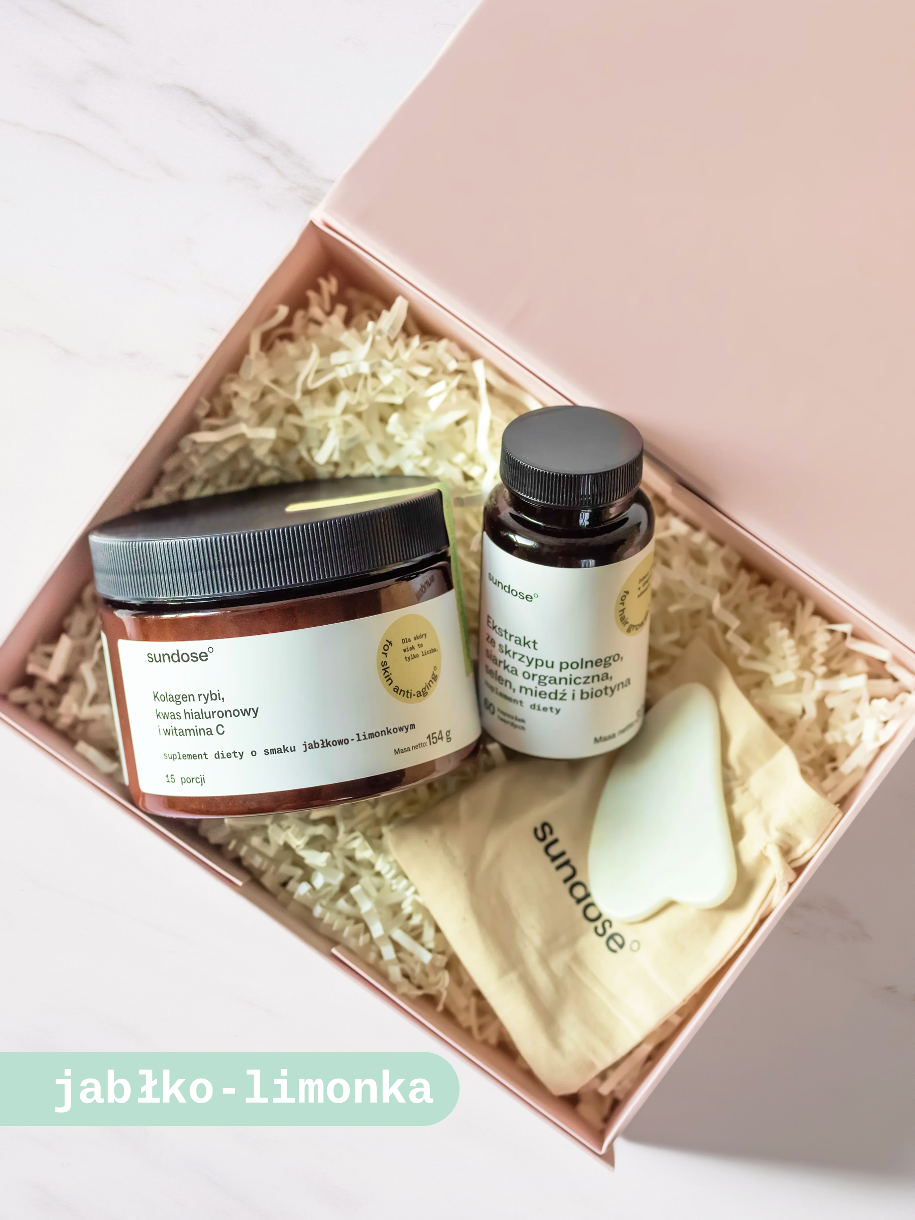 Zestaw suplementów diety w ozdobnym, różowym pudełku z zamknięciem magnetycznym wraz z białym kamieniem do masażu Gua Sha w bawełnianym etui – woreczku do przechowywania.